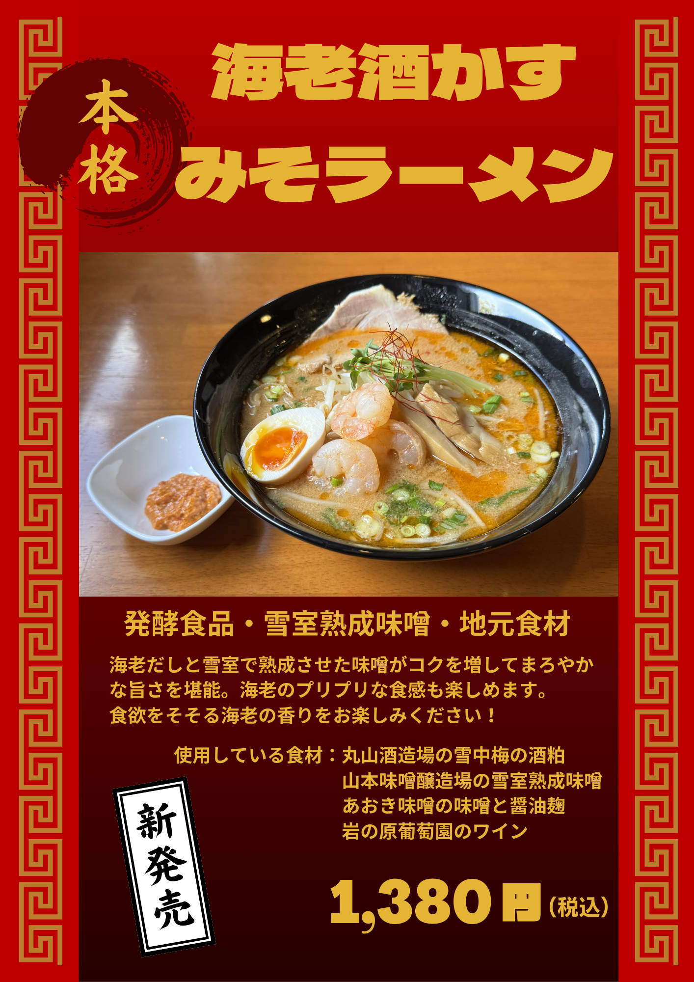 三和の青木みそと、山本味噌醸造場の雪室熟成味 噌、そして上越の銘酒「雪中梅」の酒粕を使用した、コクの深い一杯です。 当店自信のチャーシューメンとの相性が抜群です。 お好みで地元の香味調味料「かんずり」を入れてお召 し上がりいただくと、一層味に広がりが出ます。